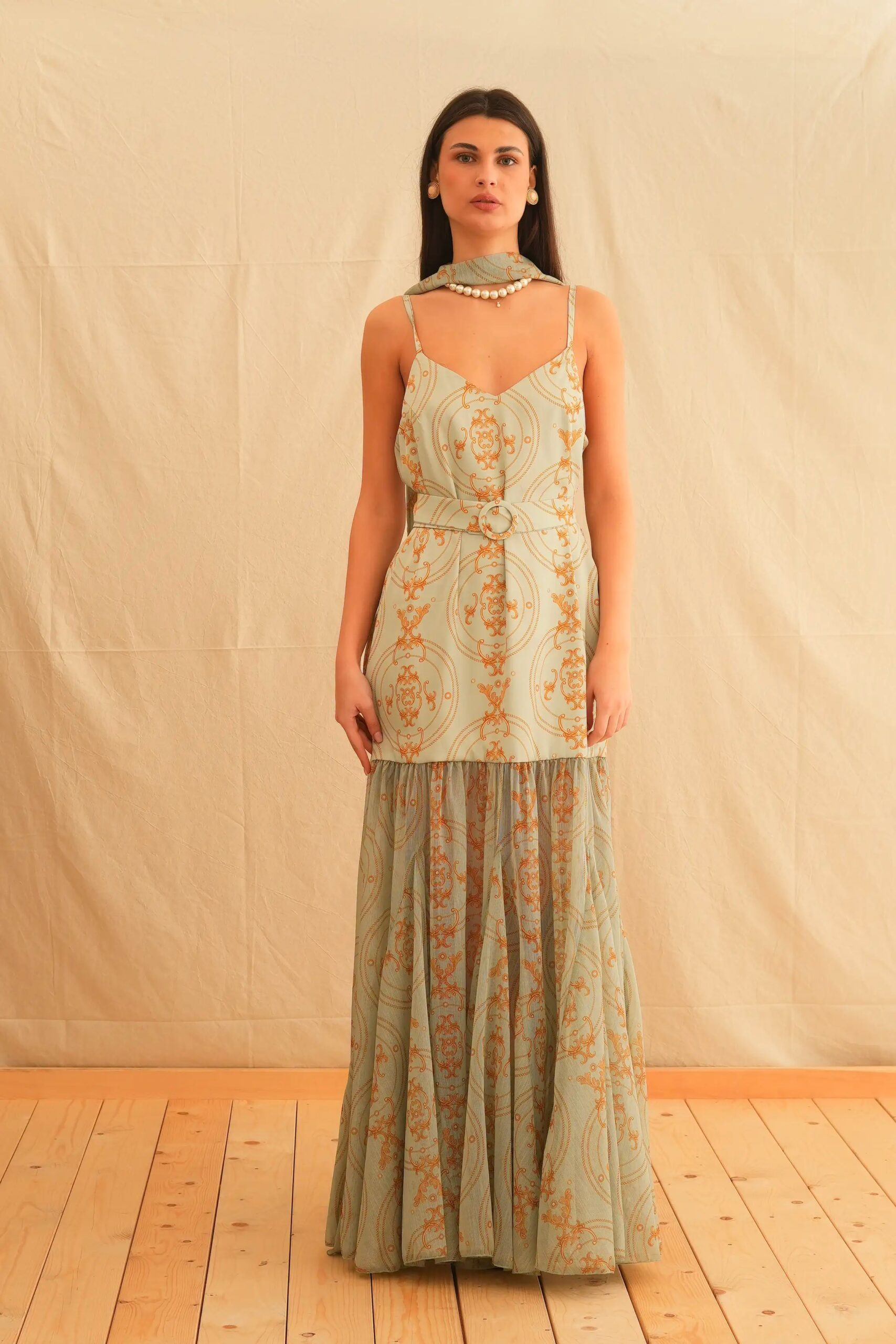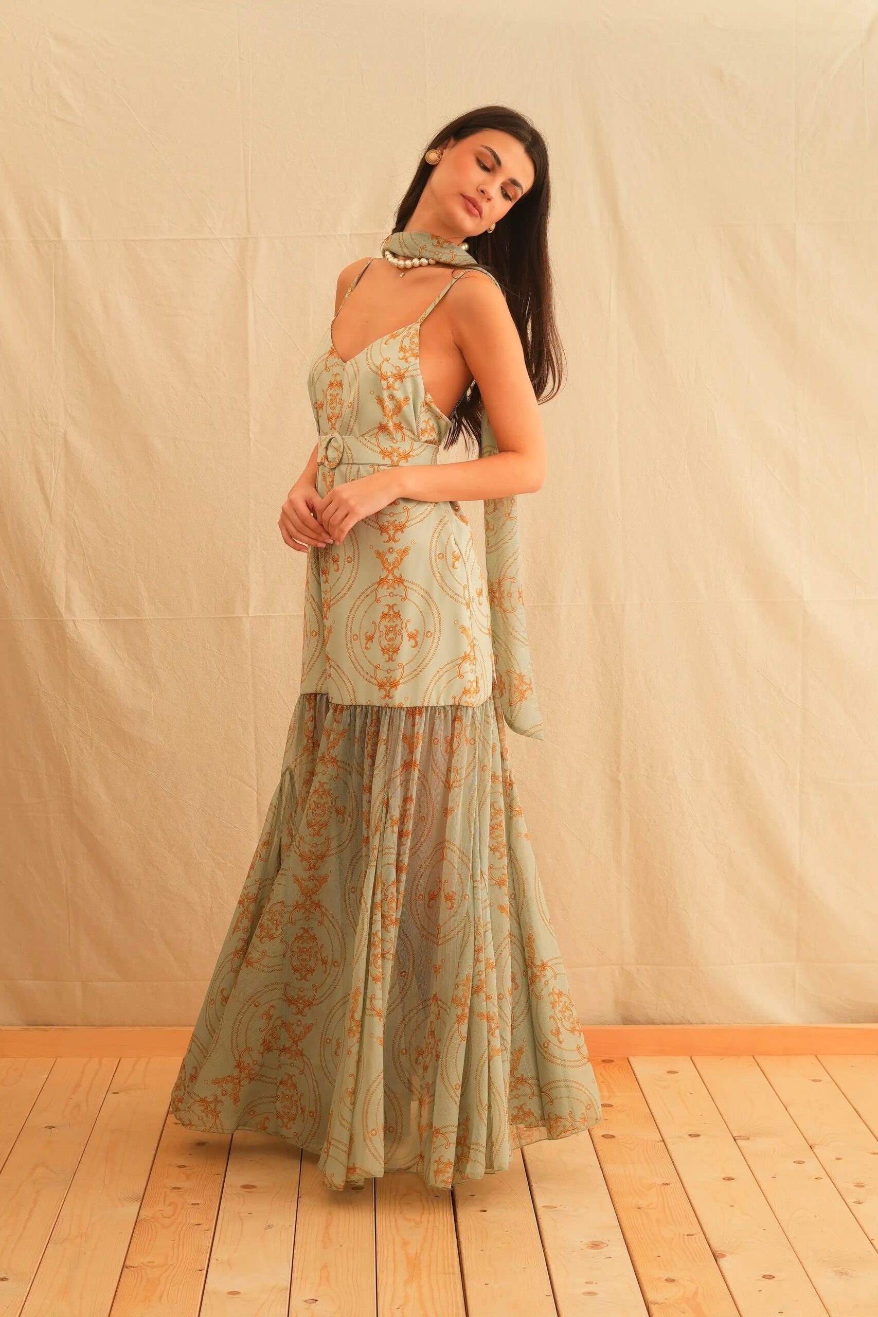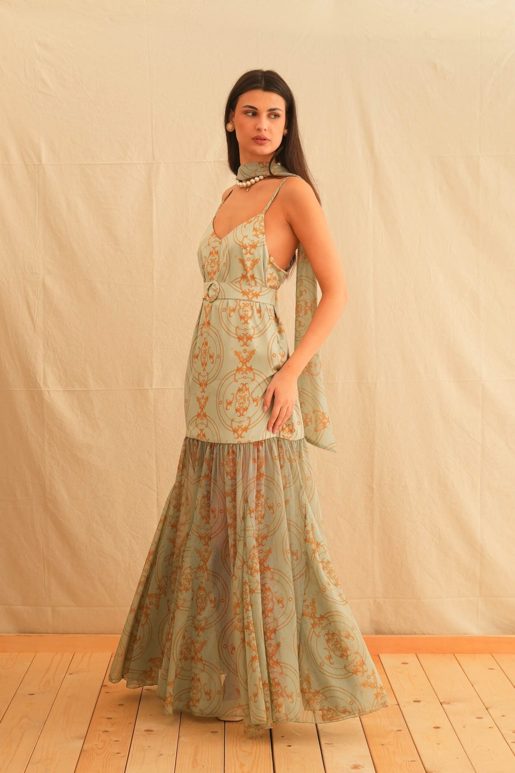 Golden mint maxi dress GEORGINA TRIKOGIA: Φόρεμα maxi σε πράσινο χρώμα με print από την GEORGINA TRIKOGIA. Διαθέτει υφασμάτινο φουλάρι και ζώνη.