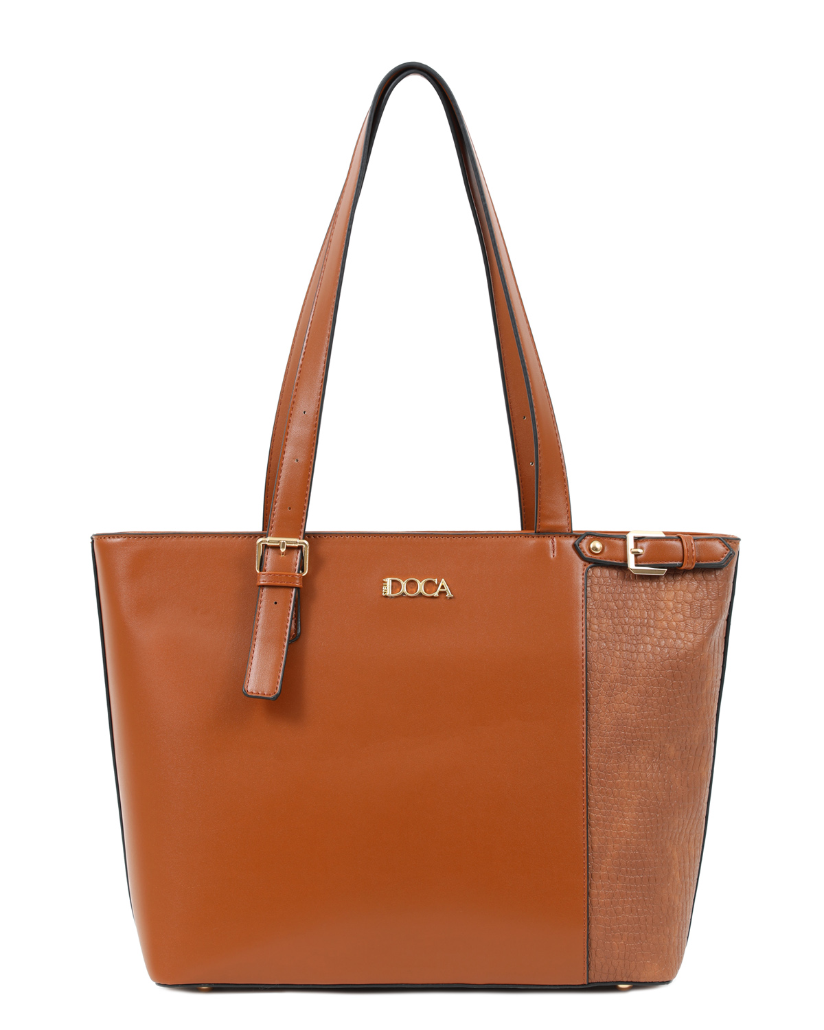 Τσάντα ώμου κάμελ DOCA 22924, κατασκευασμένη από 100% PU με διακοσμητικές λεπτομέρειες.
