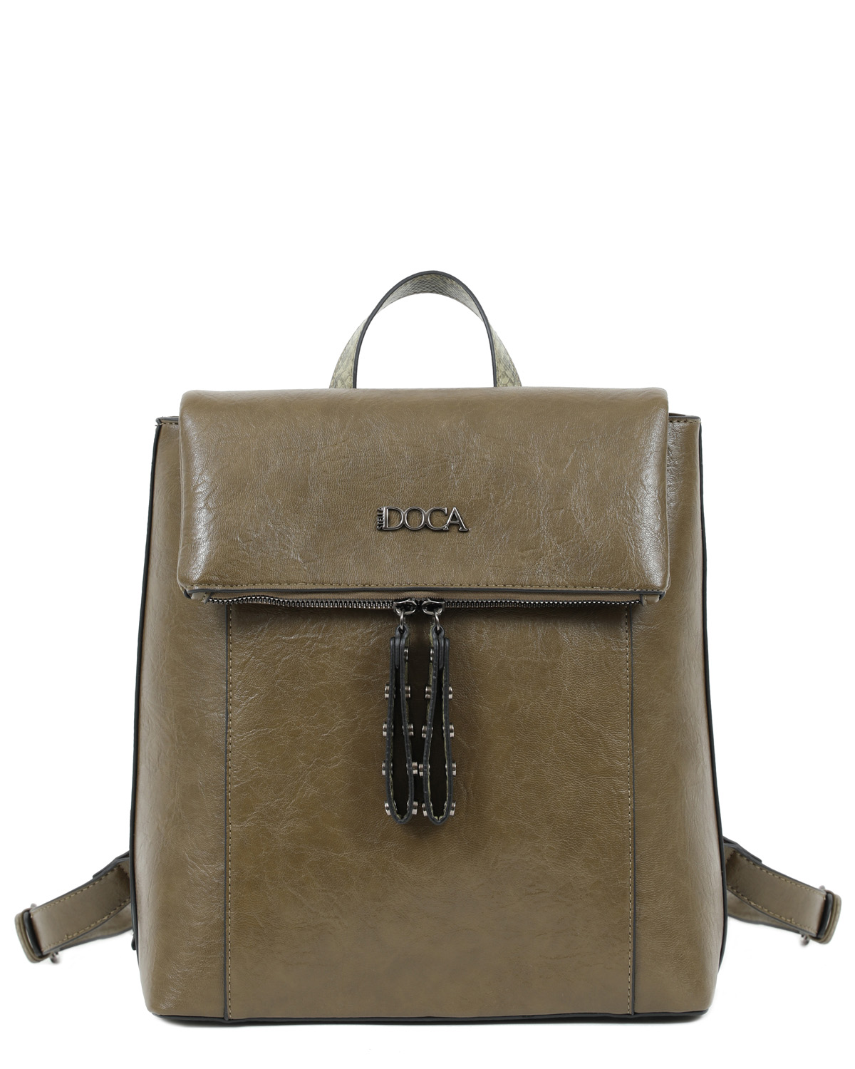 Τσάντα πλάτης χακί DOCA 22932, κατασκευασμένη από 100% PU με διακοσμητικές λεπτομέρειες.